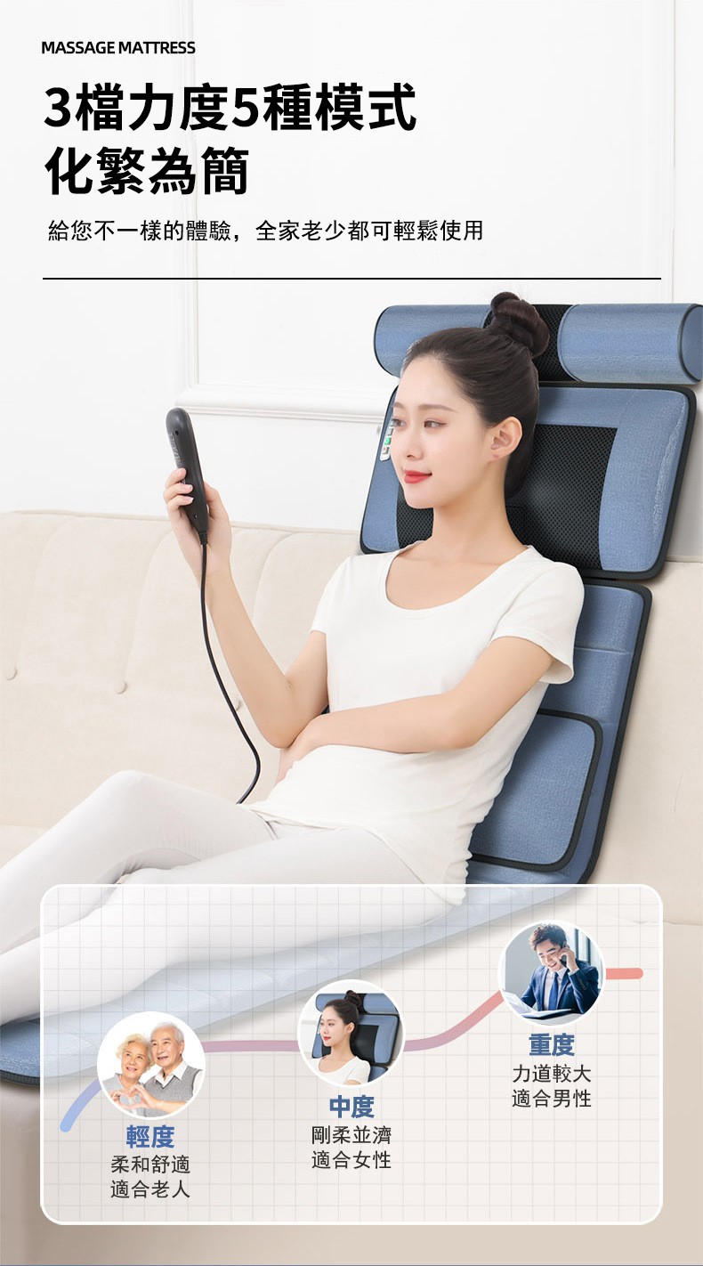 11分鐘前多功能全身按摩床墊 | 電動加熱頸椎、腰部、背部、腿部全方位按摩器,舒緩身心疲勞 - 6鍵旗艦款(6鍵揉捏+震動+氣囊+10電機+腰部熱敷)