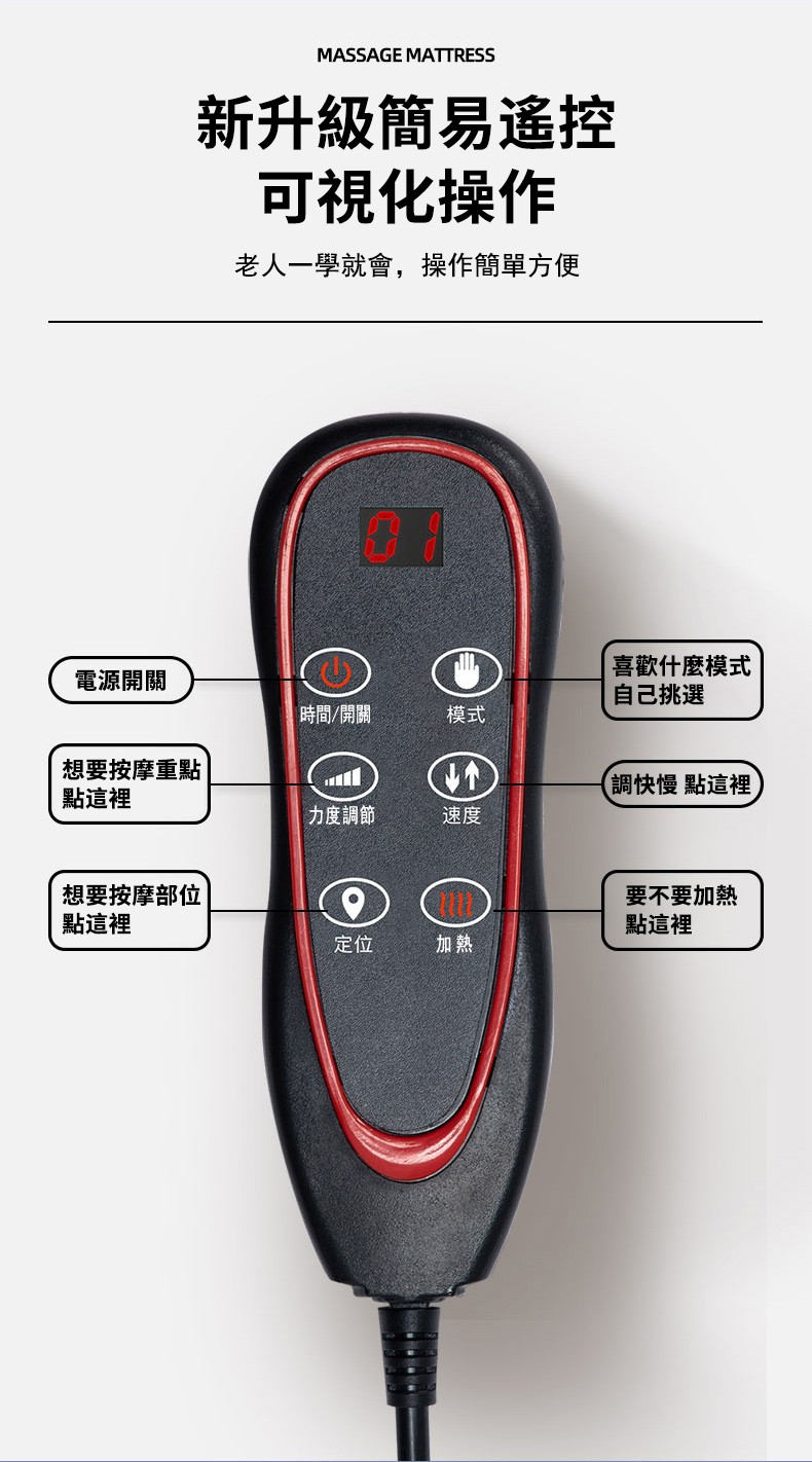 20分鐘前多功能全身按摩床墊 | 電動加熱頸椎、腰部、背部、腿部全方位按摩器,舒緩身心疲勞 - 6鍵旗艦款(6鍵揉捏+震動+氣囊+10電機+腰部熱敷)