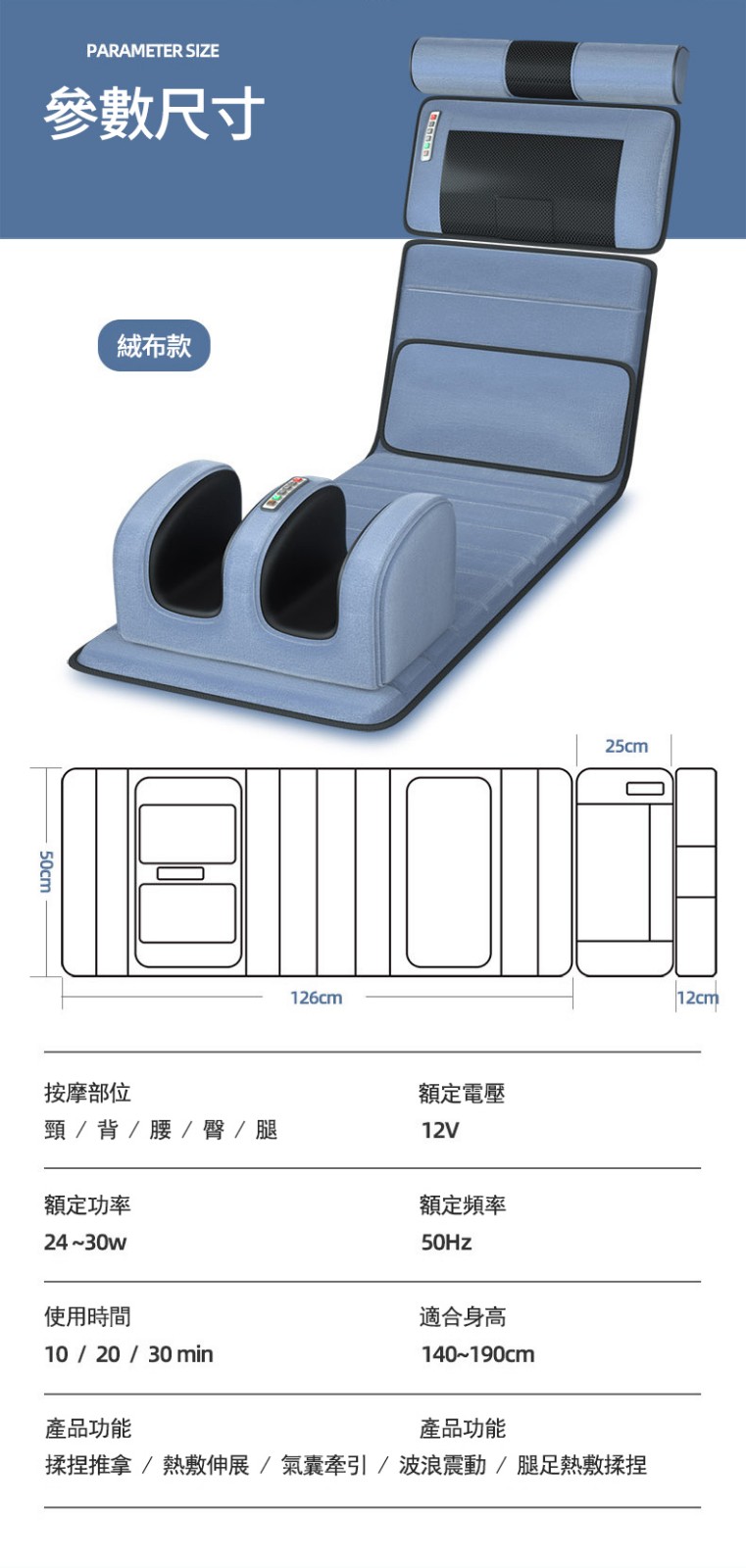 7分鐘前多功能全身按摩床墊 | 電動加熱頸椎、腰部、背部、腿部全方位按摩器,舒緩身心疲勞 - 豪華皮質款五合一可拆卸(藥枕+頸部滾輪+震動加熱+【腿部加熱揉捏】)